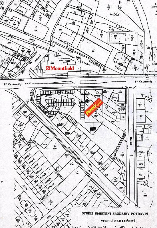 Ještě jsme si ani nestačili "osahat" nový supermarket Tesco a již se na těchto stránkách velmi živě diskutuje na téma dalších variant. Ve hře jsou v současné době dvě nabídky a to od společnosti Discont Plus a Penny Market. Zatímco prvně jmenovaná společnost nebude mít zřejmě problém s realizací stavby o Penny Marketu se to říci nedá. Discont Plus by měl být stavebně realizován v prostoru mezi silnicí E55 a firmou Hanson, zatímco Penny Market je plánován v poněkud citlivější zóně nedaleko Malého náměstí. Z následujícího plánku lze vyčíst plánované umístění. Původní záměr stavby již byl předchozím městskou radou schválen, nicméně doposud nebyl podepsán kontrakt. Momentálně je pomyslný míč na straně města Veselí a jeho starosty. Původní diskuse zde: http://www.veselsko.cz/komentare.asp?id_fora=3&sort=date