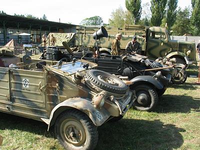Německá a americká dobová technika (motocykly, osobní a nákladní automobily, 1 x obrněné vozidlo sdkf 251)