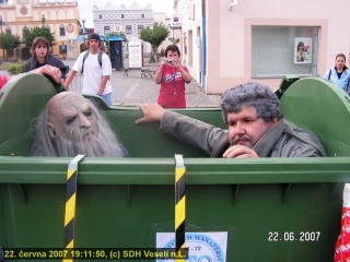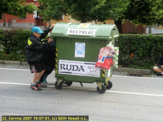 Při páteční jízdě z kopce na čemkoliv bylo zastoupení dokonce dvojnásobné. Bohužel to však znamenalo, že jsme tvořili dvě třetiny startovního pole. Ano, pouze tři vozidla se spustila z kopce na veselském náměstí. Pro posádku s názvem Ruda servis s.r.o. bylo výsledkem první místo, monstrózní vozidlo pod názvem Požární hasičárna skončilo na bronzové příčce.