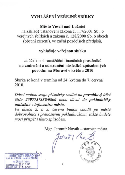 Veselí vyhlašuje povodňovou sbírku na pomoc Moravě25. května 2010, Obec , přečteno 4307x, komentováno 2x