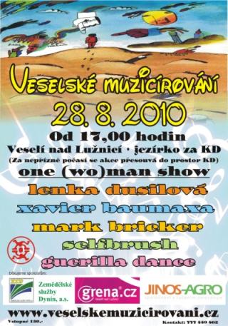 V sobotu 28.8.2010 bude mít pokračování nepravidelný festiválek Veselské muzicírování, který připravuje Luděk Lou Myler. S podtitulem One (w)oman show začne v 17 hodin u rybníčka za kulturním domem.