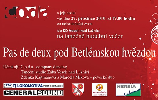 pozvánka na taneční vystoupení CODA, hosté: TS Žába a pěvecké duo Zdeňka Kajtmanová a Marcela Míková