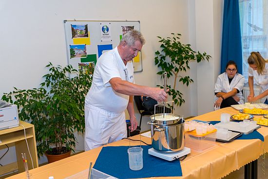 Pan Josef Pánek, ředitel závodu Madeta Řípec, představil žákům nejkrásnější mlékárenský obor – sýrařství. Seznámili se s výrobou čerstvých smetanových sýrů z pasterovaného mléka, sami si vyzkoušeli nalévání sýrového zrna do tvořítek a formování sýřeniny. Praktickou ukázku technologie doplnil pan Pánek zajímavým vyprávěním o historii sýrů a o rozmanitosti jejich druhů. Sýry, které vyrábí Madeta, mohli žáci díky našemu největšímu mlékárenskému podniku ochutnávat během celé prezentace.